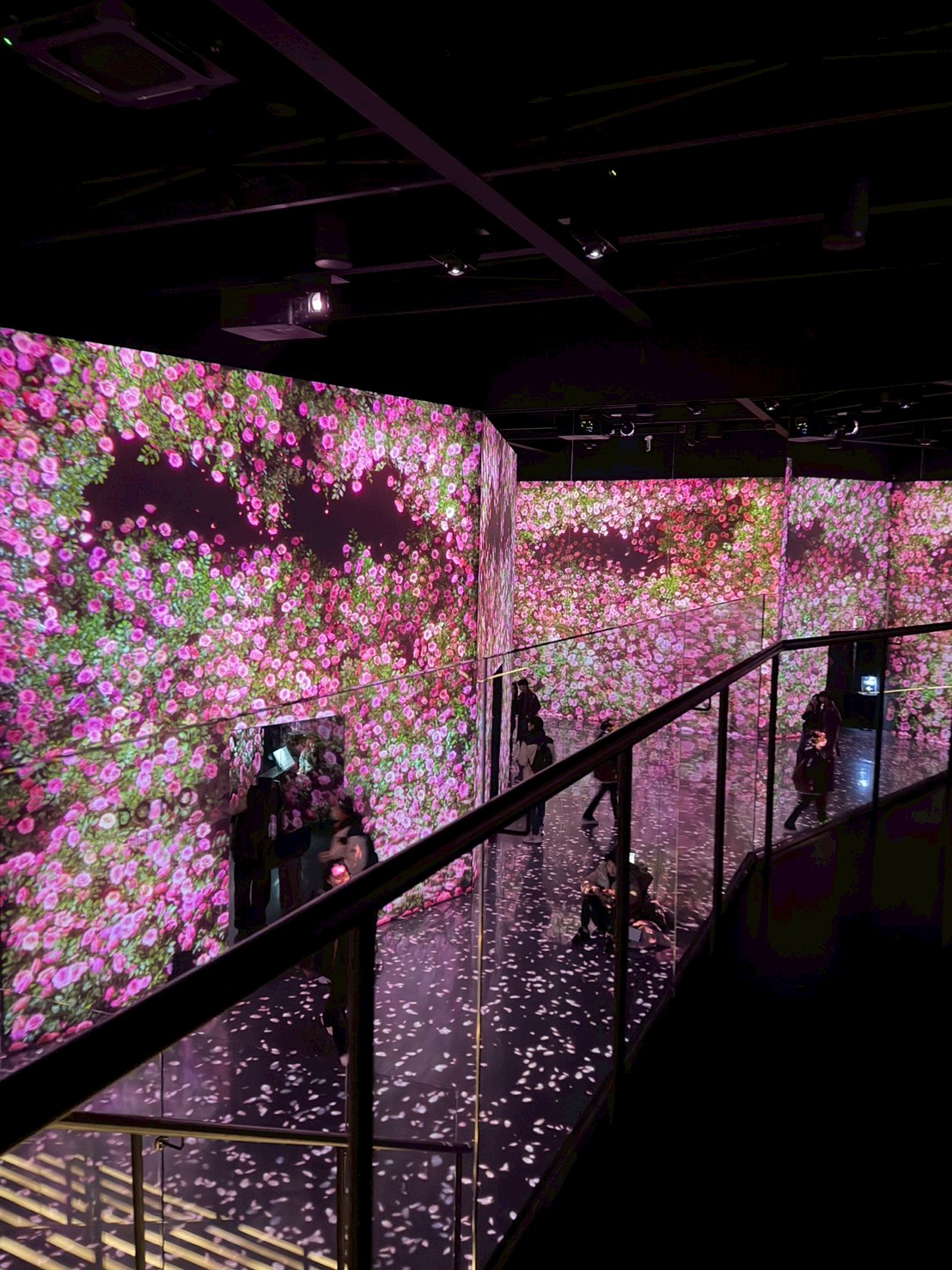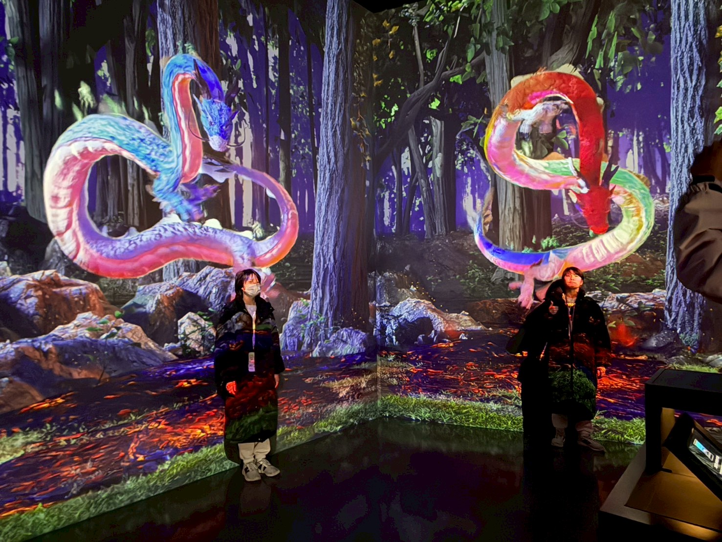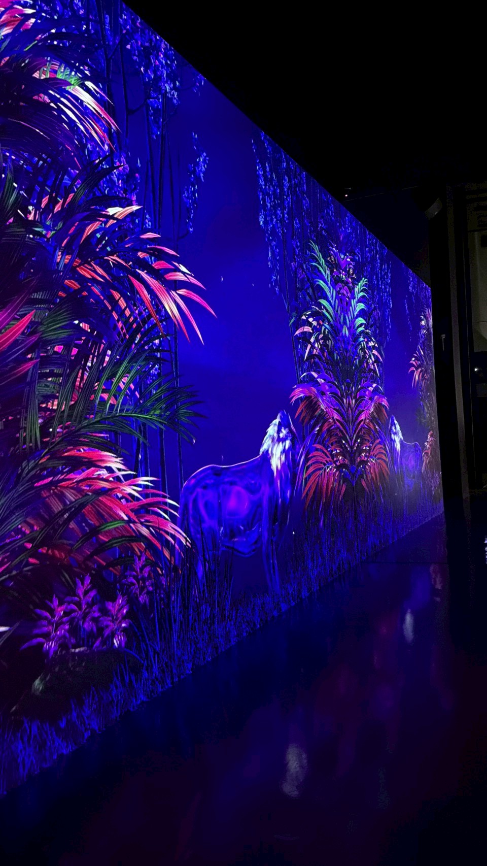 空間挑高、尺度寬廣,是它最迷人的地方之一。每個展間都有完全不同的節奏與氛圍,有的震撼、有的療癒、有的神秘。你會明顯感受到:這不是單純的投影,而是「為這個空間量身打造的作品」。即使假日人潮較多,也不會有太過擁擠的壓迫感,整體體驗依然舒適喔!