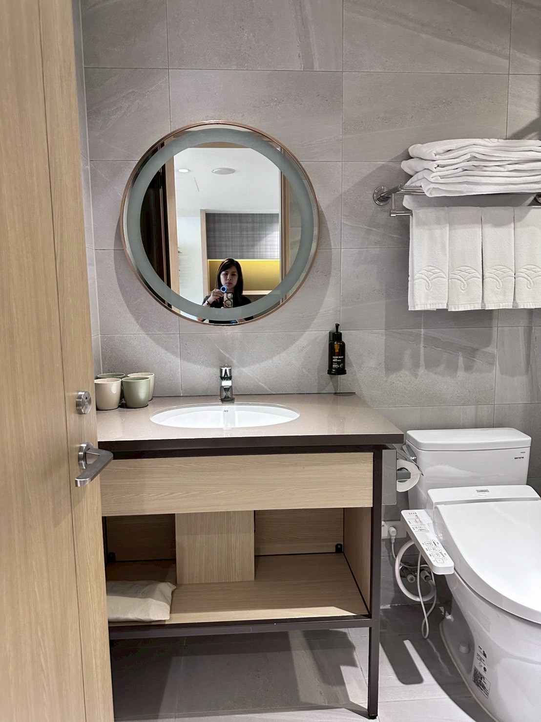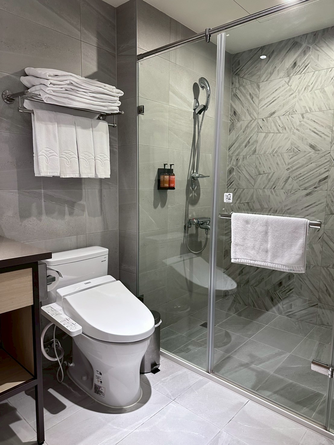 衛浴則是獨立淋浴,有免治馬桶、觸控打燈梳妝鏡,讓沐浴洗卸時更輕鬆舒適配備乾淨便利,目前響應環保不提供一次性的盥洗用具喔!請記得帶牙刷牙膏等個人清潔用品。