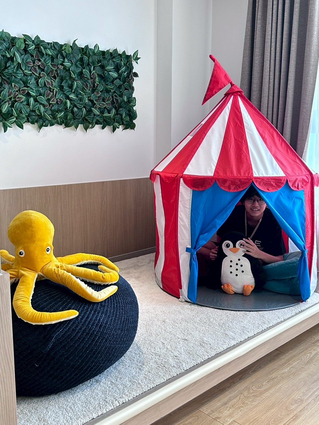 鯊鯊房內還有專屬遊樂小角落,配置一個迷你帳篷,裡面擺放著海洋小玩偶們,讓小朋友們擁有自己的秘密基地,也讓親子互動多了更多樂趣。