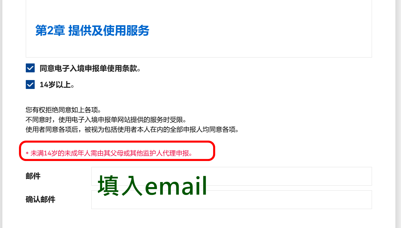 按照頁面上面的內容開始填寫,先選電子入境申報(個人申報),勾選全部同意條款,這是閱讀並同意個人資料收集與使用條款。未滿14歲由父母或監護人代理申報。