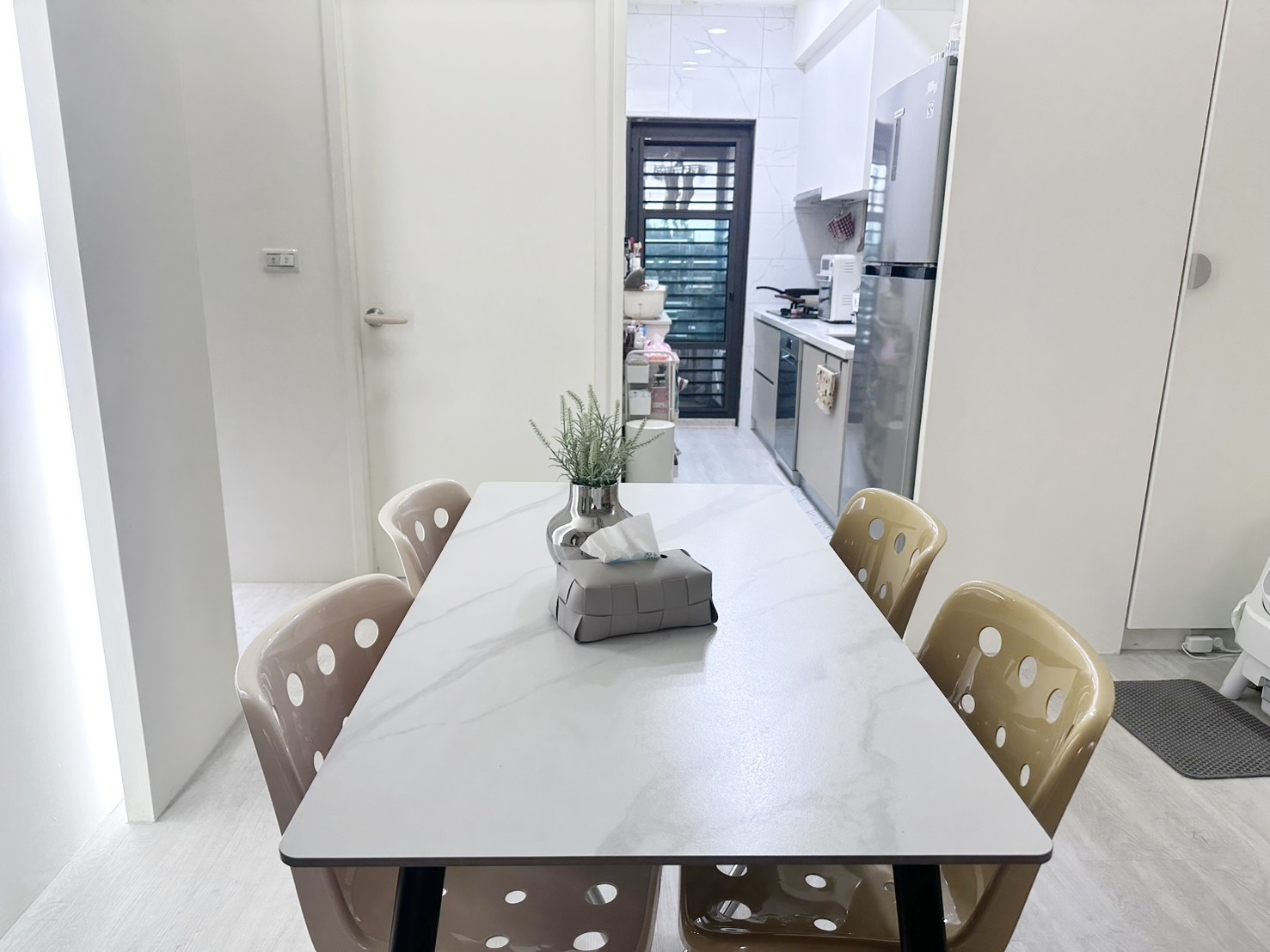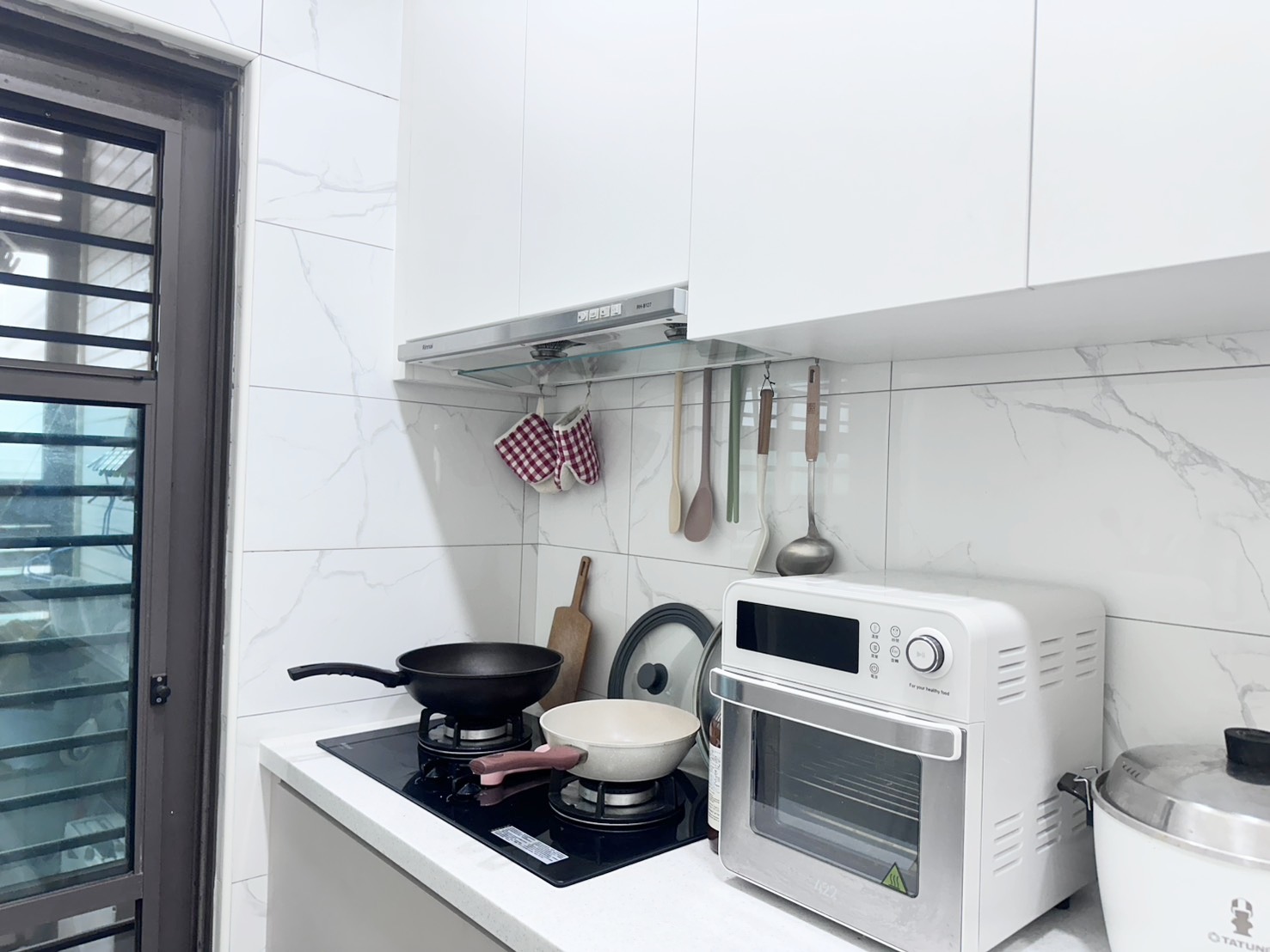 原屋主這邊已經有做了一個隱藏收納櫃可存放物品,所以廚房這邊其實算半開放式,