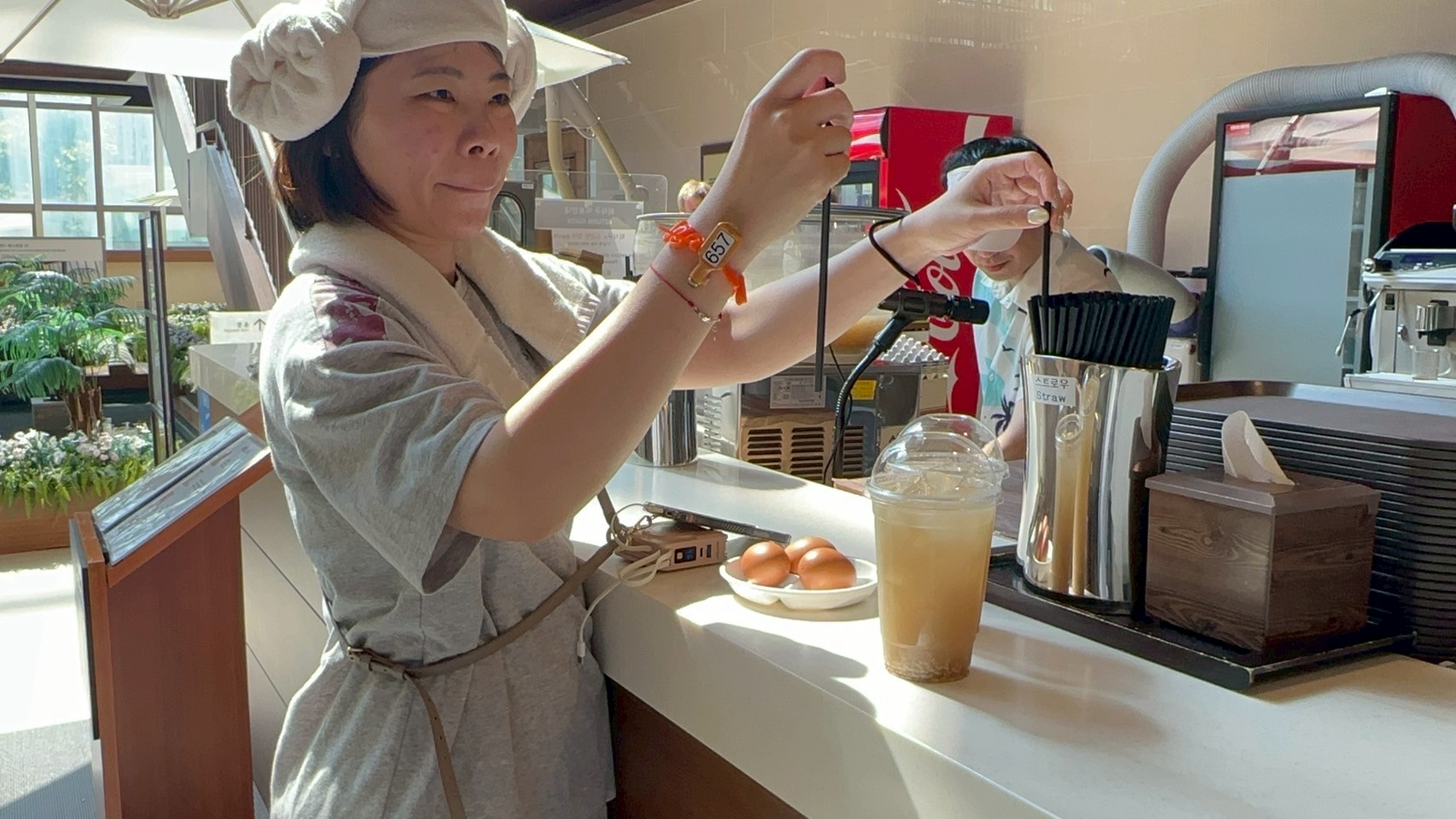 像我們最喜歡的當然是用餐區與泡麵機,可以享受烤蛋、甜米釀與 DIY 泡麵樂趣,拜託不要像我用額頭敲烤蛋,那是騙人的!痛到爆!害我在那邊大吼~甜酒釀喝起來很像我們的綠豆湯,也沒什麼酒味,蠻奇特的!烤蛋味道也很奇特,口感超Q,邊吃邊喝邊玩還要帶個羊角頭,是不是很接地氣?