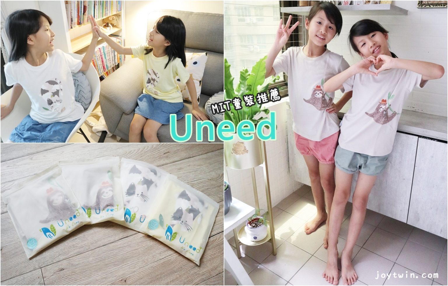 先看一下這次給雙寶妞選擇的Uneed鋅衣服 天然有機棉T吧! 像現在兩個小孩身高體重是133公分/23~24公斤,屬於偏瘦的體型,但小孩有時也大的蠻快的,所以這次Uneed童裝我就直接選擇140cm的!這樣萬一暑假期間突然被養胖~孩可以穿好一陣子!給兩位小孩挑選了他們喜歡的動物圖案,分別是貓咪跟樹懶~