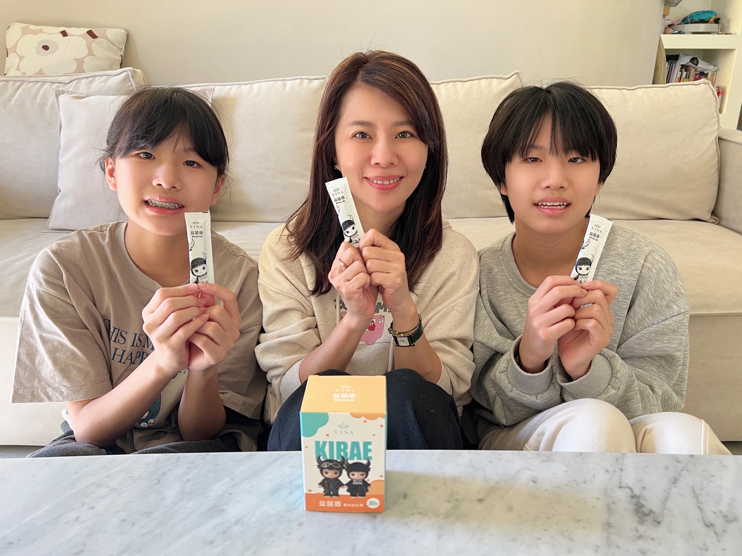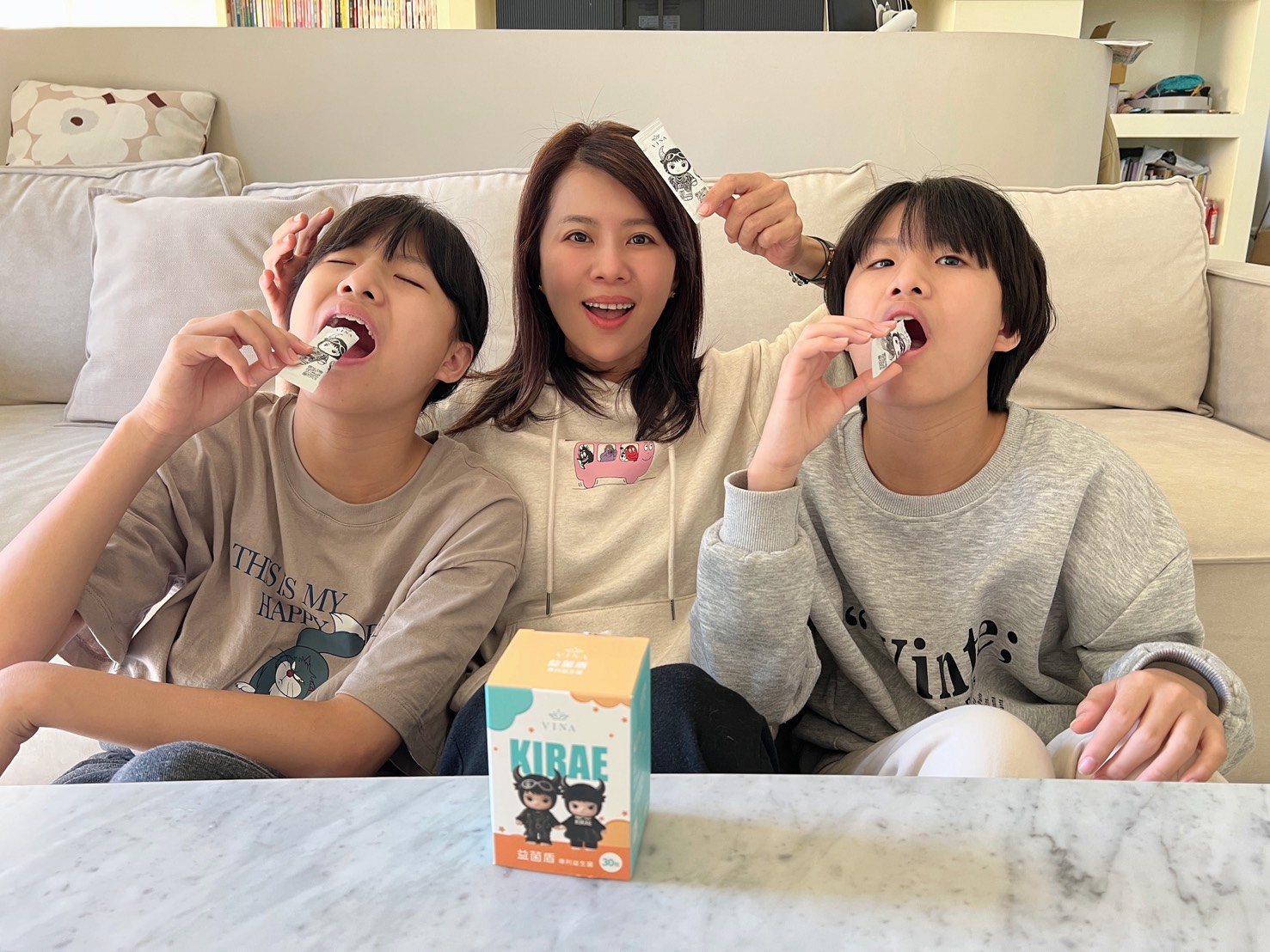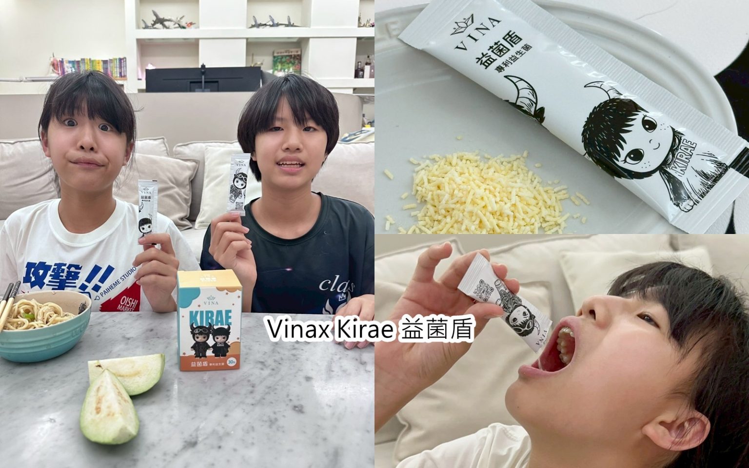 孩⼦換季容易卡卡,爸媽⽤益菌盾守護健康;現在我們家兩個小孩都主動吃Vina x Kirae益菌盾,覺得每天都像在開盲包⼀樣期待!美味健康,活力滿分!